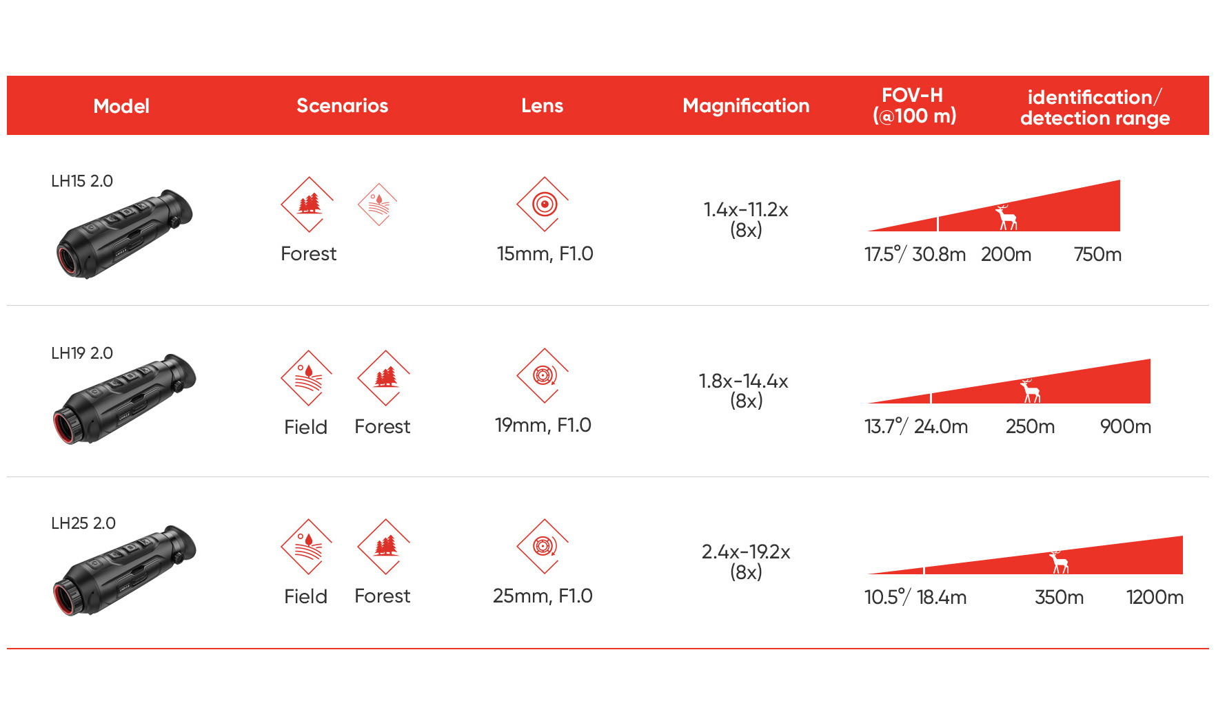 | Field of View(H × V), Degrees / m @100m | 17.5°×13.1°/ 30.8m×23.0m | 13.7°×10.3°/24.0m×18.0m | 10.5°×7.9°/ 18.4m×13.8m |